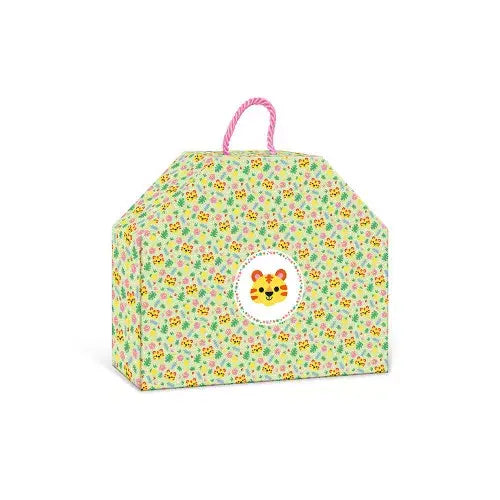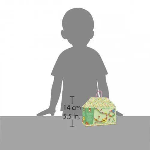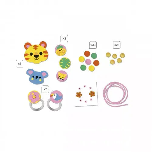 Create your own set of wooden jewellery! This set allows you to make 1 necklace, 1 bracelet and 2 rings on the theme of the jungle, thanks to a comprehensive range of content: 2 shaped and printed wooden beads, 3 round printed wooden beads, 33 coloured round beads, 22 gold beads, 2 rings with printed flat wooden beads, 1 sheet of 8 rhinestones, 1 elastic thread and 1 booklet with instructions and designs. The box becomes a cute handbag in which you can keep your jewellery and other little secrets. This activity helps develop creativity and motor skills and is suitable for children aged 4 and over.