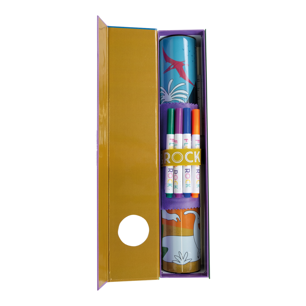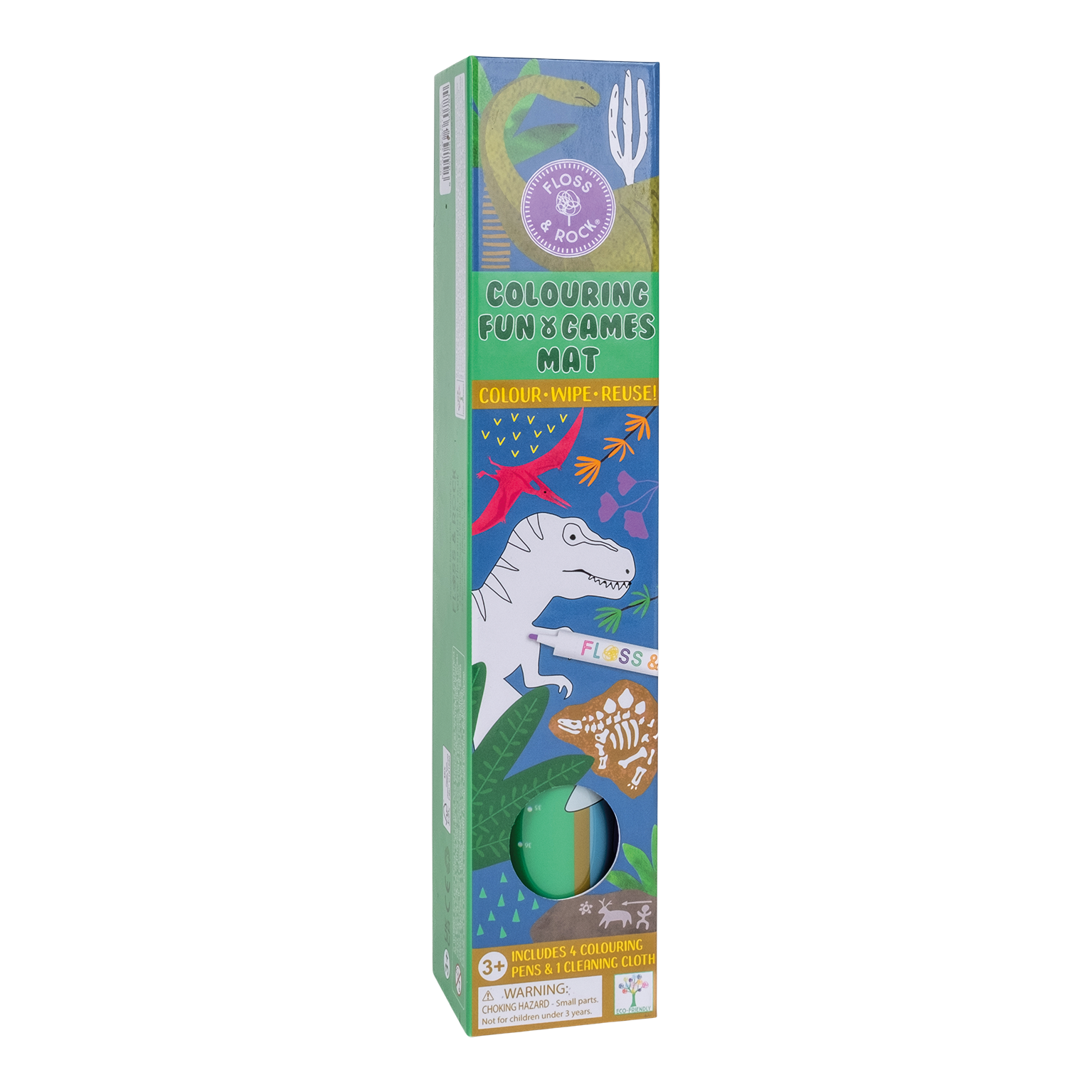 COLOUR. WIPE. REUSE. Our brand new Colouring Fun, Games Mat is a brilliant multi-play activity for travel. Simply roll out the mat for colouring, dot-to-dot, a maze and ‘tic tac toe’ games. When finished, wipe clean, roll up and use the fastening band to pack the mat away in the handy box to use over and over again! Our ROAR-some Dino design features all of your favourite Floss & Rock dinosaur illustrations. The mat includes 4 colour dry wipe pens, a handy cleaning cloth, fastener band and a reusable storage box.