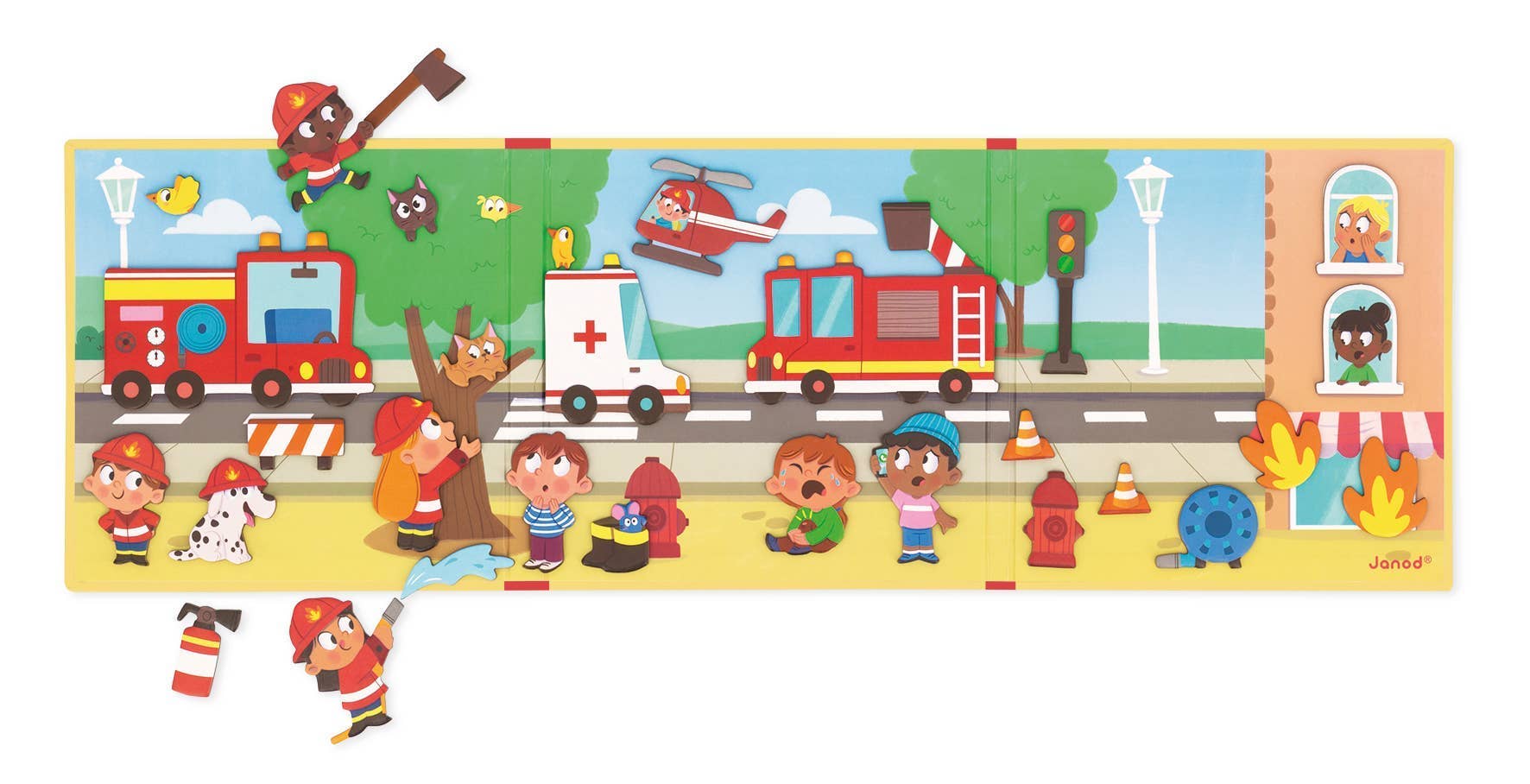 Be a firefighter for the day! A fire has engulfed a shop and a little girl has broken her leg, but thankfully, the fire engine and ambulance aren’t far away! Open up this adorable book to discover a large magnetic backdrop and 30 magnets to help little ones invent lots of firefighter-related stories. Practical: this pocket-sized book can be taken everywhere! Magnetic toy made from FSCTM cardboard. Toy for children aged 3 and up.
