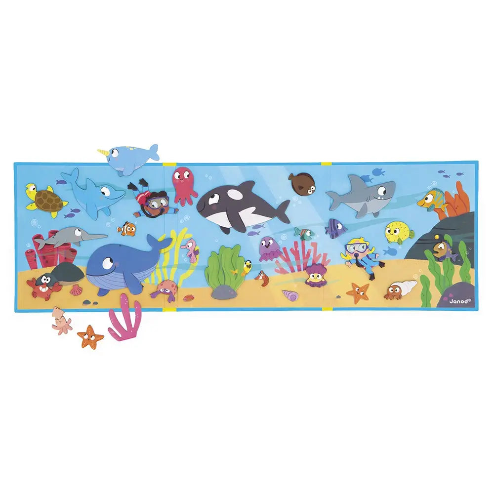 Welcome to the world beneath the sea! Dive in and discover the inhabitants of the ocean, from the playful dolphin to the curious starfish, all waiting for your child to enjoy some new adventures! Thanks to the large magnetic background and 30 magnets representing fish and shellfish, your child will be able to come up with all kinds of aquatic stories. FSCTM magnetic cardboard toy for children aged 3 and over.