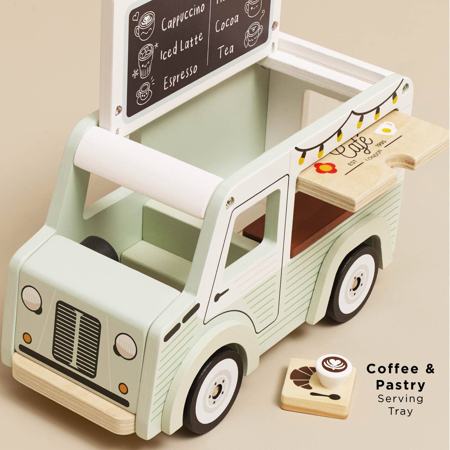Crafted from FSC®-certified wood, this vintage-style Café Van is painted in a delightful pistachio green and white and features intricate artwork on all sides. The flip-opening roof reveals a coffee and tea menu display board, while the front-opening service hatch allows little baristas to serve their customers with ease. Complete with a coffee mug and croissant on a serving tray, this set encourages creative role play.
