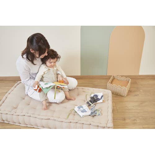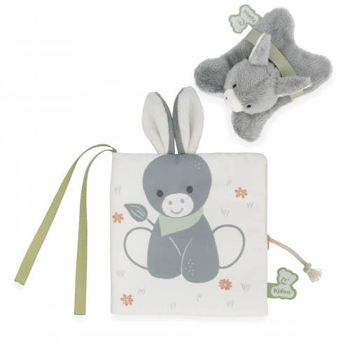 Our fabric picture guide Regliss at the farm, 5,51 inch tall, helps you connect with your baby and share tender moments together. Each picture guide presents lovely illustrations to behold, a story to tell with little donkey Régliss as he visits his farm friends, fabrics to stroke and fun activities to stimulate baby’s senses. With its ribbon, it can be hung anywhere. Its mini donkey comforter can be used to wake baby up, or to help him fall asleep by tenderly caressing his face. Machine wash at 30°. From birth.