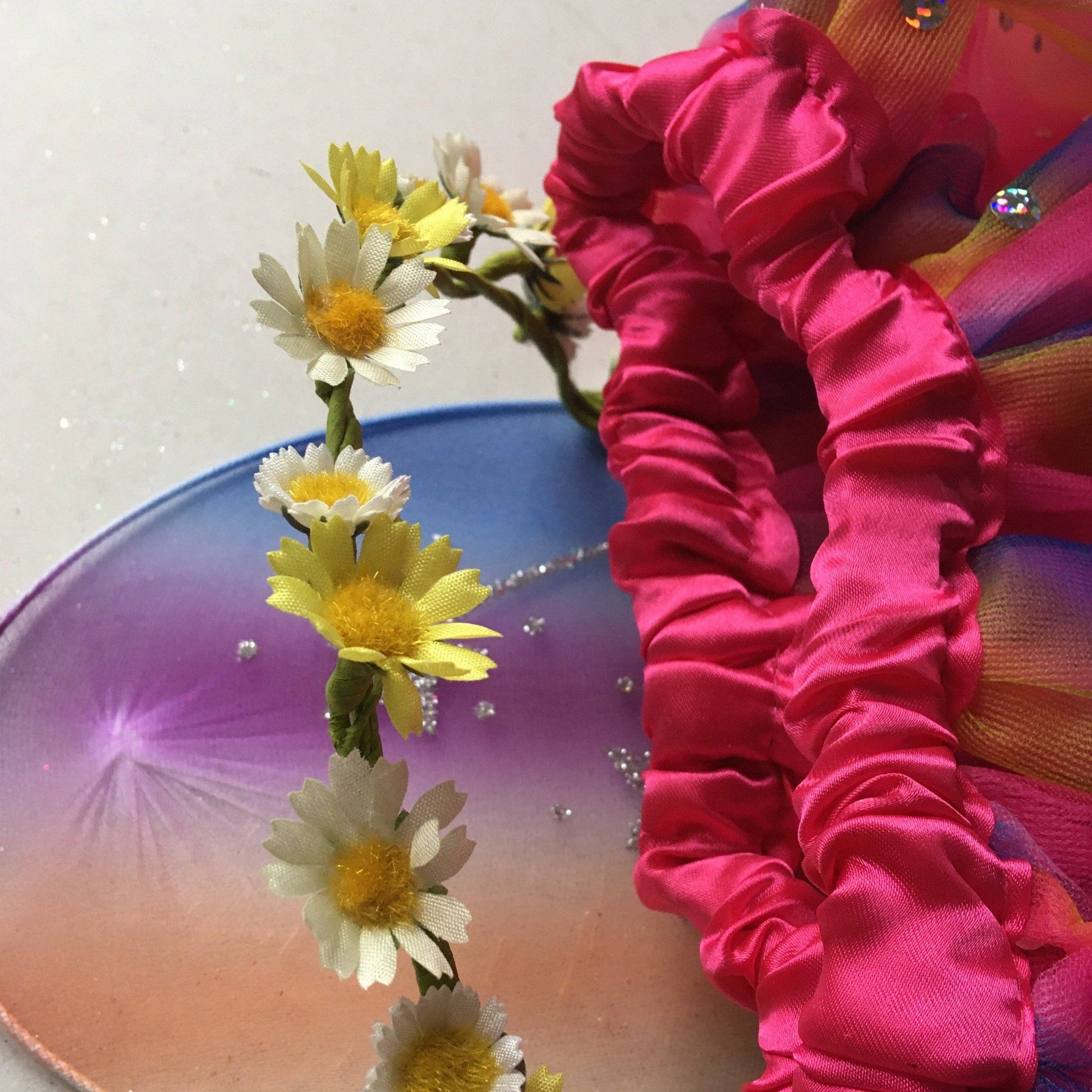 These pretty rainbow flower fairy sets for children come with a sparkle tutu, rainbow glitter wings and a mix of purple rose garlands and daisy garlands. (we are currently out of daisy garlands)